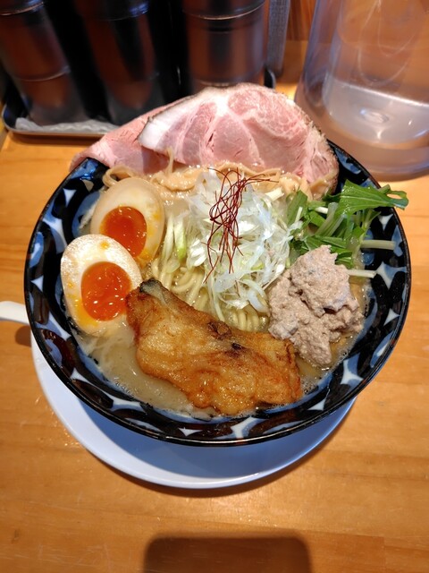 豚肩レアチャーシュー2、鱈のフリット、鱈の白子ソース、穂先メンマ2、味玉、白ネギ、水菜、糸唐辛子