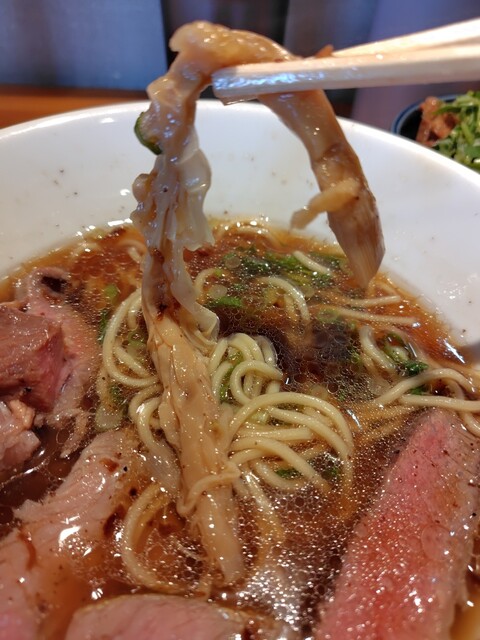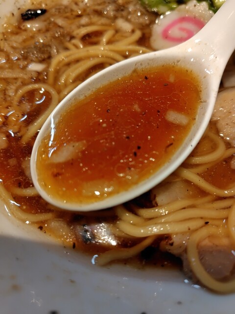 そして、かなりブラペが振られた牛骨醤油スープ、胡椒のパンチが効いてるなー