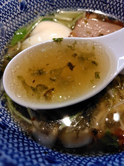 かなりしょっぱめの淡麗塩スープのつけ汁、麺と合わせるとちょうどいいんだが