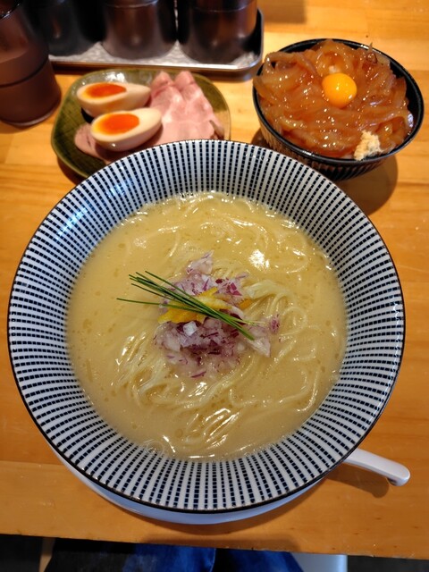 醤油らぁ麺1300円(この日限定)、ウマズラハギのタルタル丼450円(この日限定)