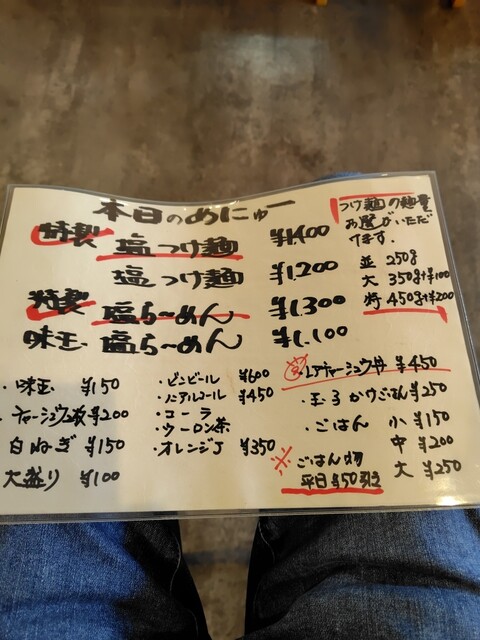 ちょうど帰られた方がいたので片付けてもらい着席、その際、目当ての塩つけ麺をオーダー