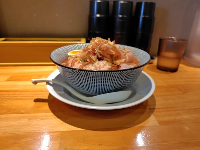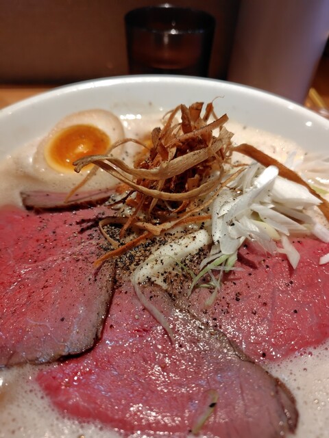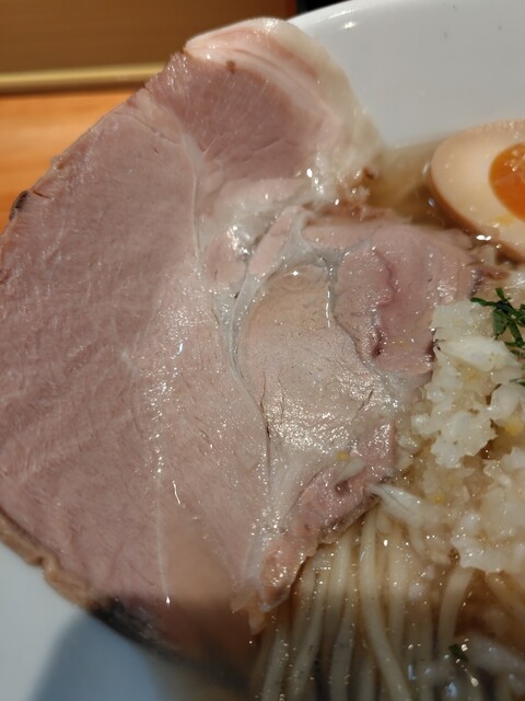 豚肩レアチャーシュー、炙り真鯛刺身2、白ネギ、芽ネギ、味玉半分