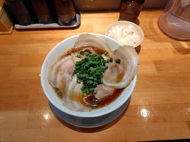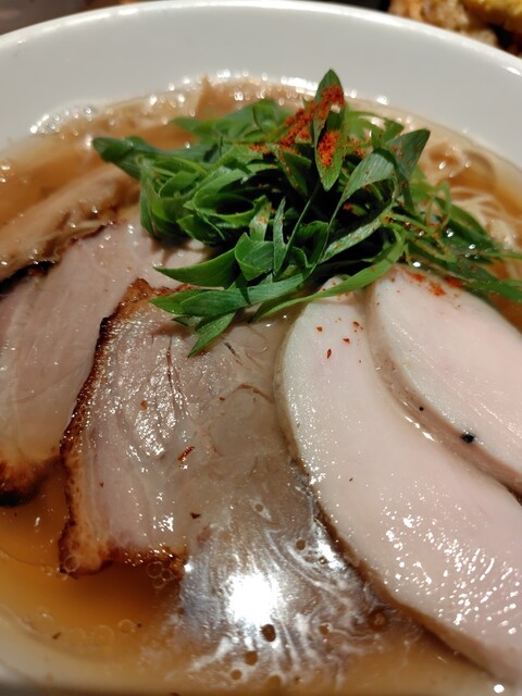 豚肩ロースチャーシュー、鶏モモチャーシュー、白ネギ、水菜、揚げネギ、かつお節、黒バラ海苔