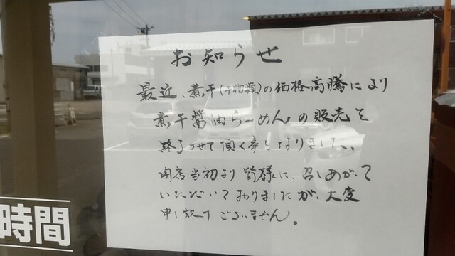 今日は塩かな~と入口近くの椅子に移動した際、窓に煮干し高騰により煮干醤油終了しましたの張り紙が!
