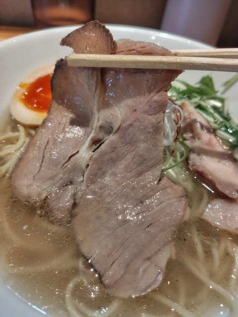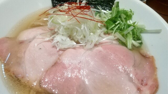 豚肩レアチャーシュー、鶏モモチャーシュー、白ネギ、水菜、糸唐辛子、味玉