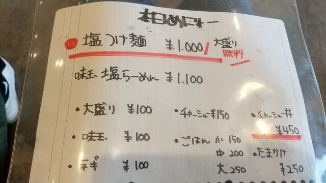 メニューを渡され、基本は塩らーめんと塩つけ麺、裏に限定メニュー