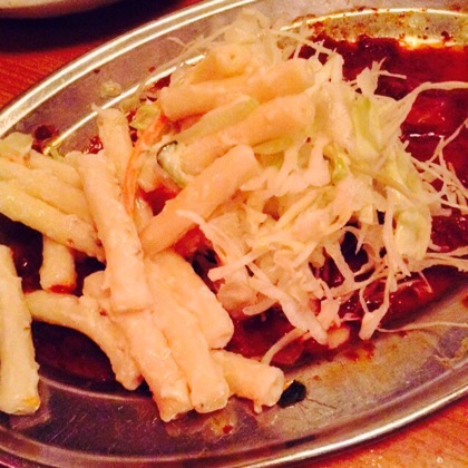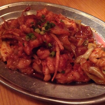 もつの辛子炒め。てっちゃんが柔らかく、辛子味噌も甘みがあって旨い。ここは上の焼き肉屋が母体なので、こういうメニューは外れないんだな。