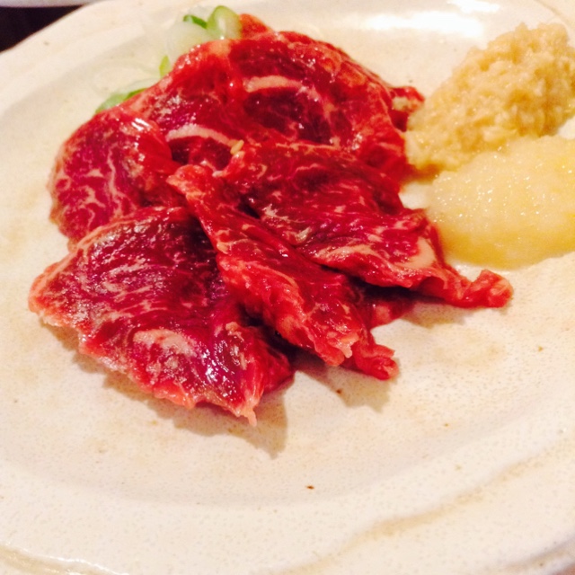 馬肉刺しは薬味のショウガとニンニクを効かせていただきましょう。これまたトロッとして焼酎に合うんですなwww