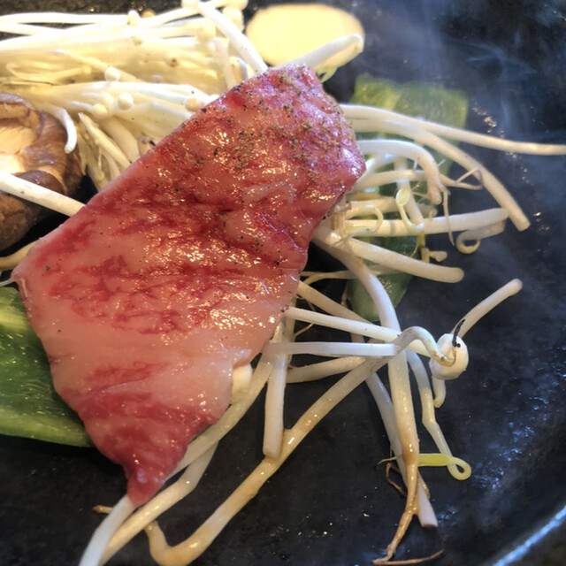 もやし、えのき、ピーマン、玉ねぎと陶板に並べ、次に「特選近江牛」をふた切れ。