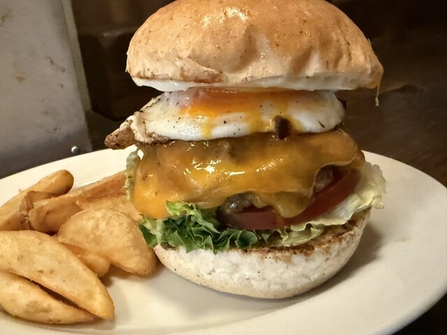 パリッとしたバンズとジューシーなパティ。かなり美味いです。肉汁、玉子の黄身、チーズもソースの役割を果たして全体をまとめています。