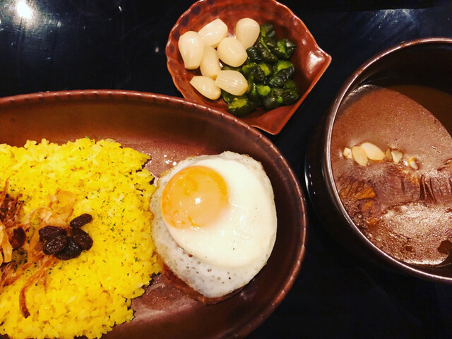 流れた黄身と壺焼きカレーを混ぜ合わせサフランライスと共に頂きます(^^)/
