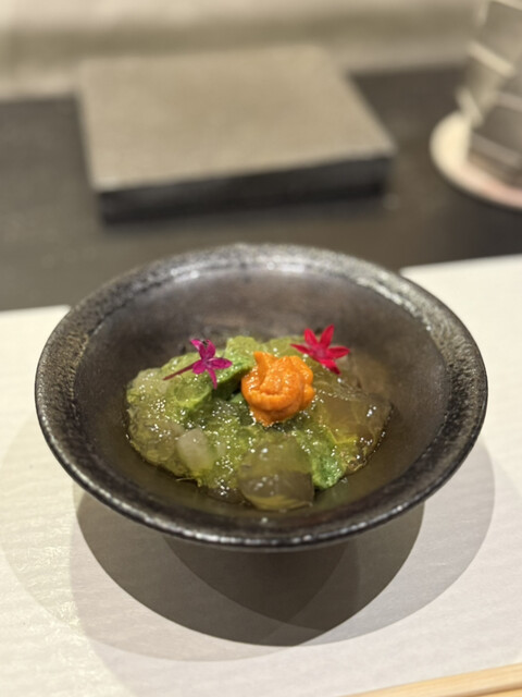 ⑧菊菜ムースのコンソメゼリー掛け 生雲丹のせ