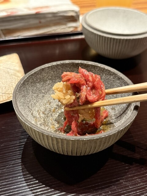 ユッケ(かめのこ)は、塩昆布、トリュフオイル、卵黄、黒胡椒の組み合わせが上品で、途中からシャリを加えることで肉寿司としても楽しめます。