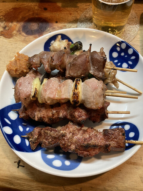 レバ2、スタミナ、カシラ、ヒナ、砂ずり、全部塩で。串天才の大将作