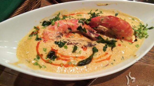 クリームベースのルゥに大振りのクルリとした海老が入っている。