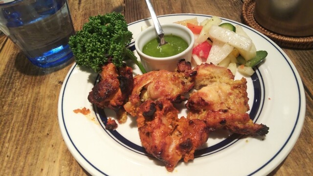 外はカリッ、中はジューシーなタンドールチキンに香辛料、レモン汁をかけて、カラフルなピクルスを付け合せていただく。