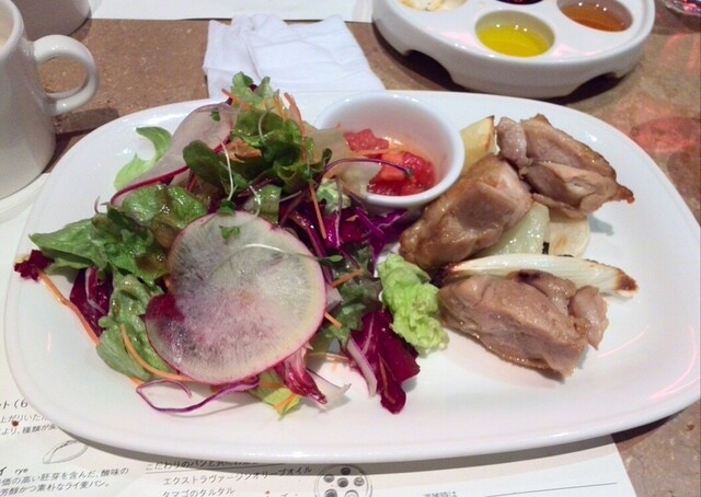 メインのグリルチキンは大山鶏。柔らかかったです。やや塩がきいてたのと、グリル野菜少なすぎがちょっと残念。添えられたトマトとバジルのソースがすごくいいお味でした。