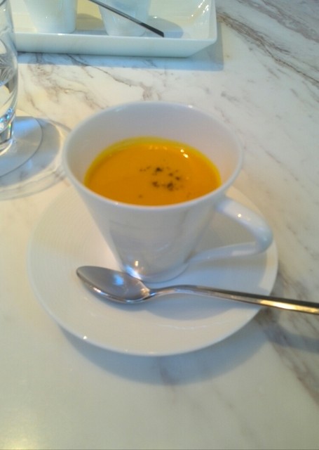 まずやってきたのは熱々のかぼちゃスープ。ミニサイズだけど美味しいです。