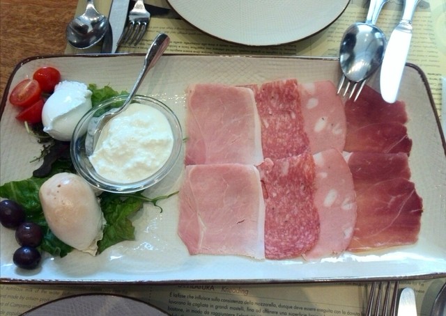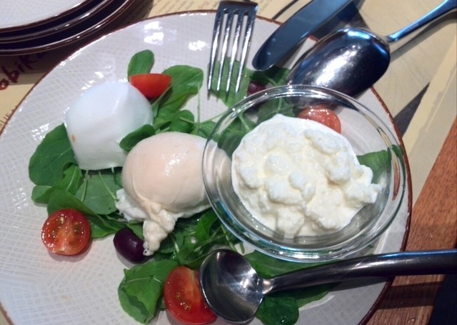 結果、美味しかったのはオリーブオイルなど含めてモッツァレラだけ。スモークされたもので、微かに穀物のような香りがします。サラダは美味しいオリーブオイルと生ハムで食べたいなー。