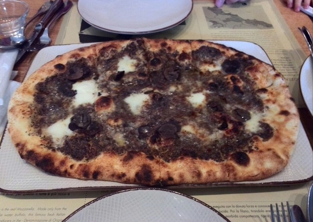 タルトゥーフォは、モッツァレラとトリュフとマッシュルームペーストのピザ。たくさんのったトリュフがものすごーくいい香り!普段特別に好む食材ではないんですが、このかぐわしさには完全にやられました。旨味たっぷりのマッシュルームペーストにまろやかな水牛モッツァレラと相まって、まさに至福の味、素晴らしいです。