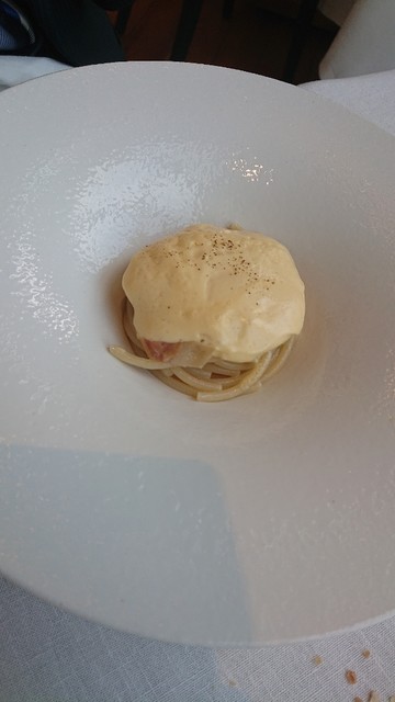 そしてパスタ。イカ嫌いの夫はカルボナーラにしてもらいました。もっちり太めの麺に、イカの香りたっぷり。