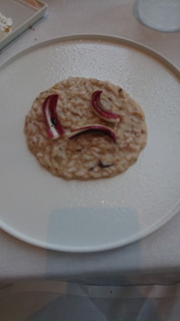 そんなわけで、お腹いっぱいで無理とおっしゃる夫を差し置いて、もちろん私だけ味見しました。洞窟で熟成されたチーズらしく、形状も味もパルミジャーノレッジャーノによく似ていましたが、ややスパイシーでくせのある感じでした。付け合わせに少量美しく配置された、蜂蜜やオレンジピールも美味です。