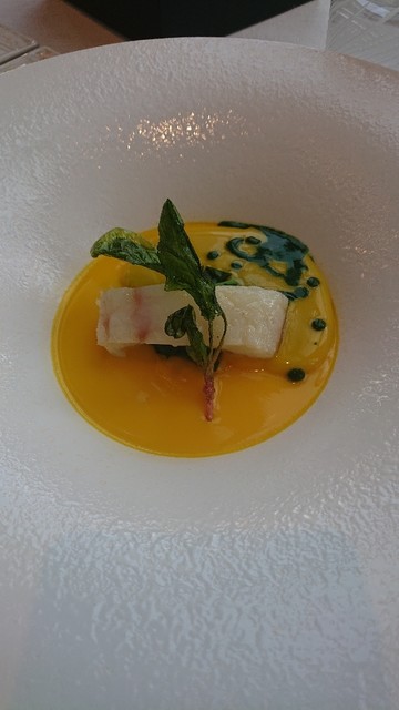 お魚は白身魚でした。サフランソースが予め敷かれていて、ほうれん草のソースは卓上でかけてくれたんですが、私のは失敗した模様(笑)夫のお皿は、きれいなバイカラーでした。魚が苦手な私にはややレア過ぎたかなぁ。