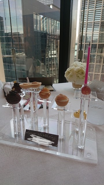 そして、ついに最後の小菓子。インスタ映えする(インスタもフェイスブックも好きじゃないからやってないけど)、台にのって登場。ハッピーバースデーのチョコプレート、プチチョコレートシュー、ピーナッツクリームたっぷりのピーナッツ型最中(最中の皮好きだね?)、レモンタルト、レモングミ、ぶどう。お腹いっぱいだけど嬉しい!