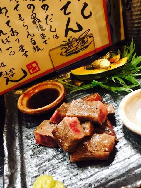 おでん屋なので、おでんが美味しいのですが他の一品も素晴らしく期間限定の鯖棒寿司やしめ鯖。鯖棒寿司は麦飯を酢飯にしており炙り鯖でやってます。身厚で美味しく。ある時は毎回注文してます。そして和牛イチボステーキて店主のこだわりの和牛イチボ。山葵と塩で口の中でトロケます。
