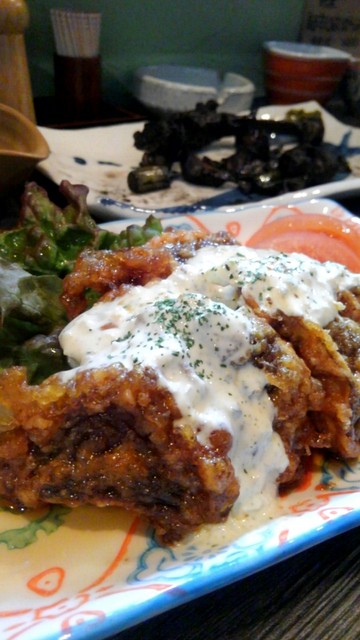 お店で人気のチキン南蛮、せせり南蛮がありますが今回新メニューは椎茸南蛮。身厚の椎茸をチキン難波の風にしてます。店主が宮崎で食べて美味しかったので作ってみたそうです。