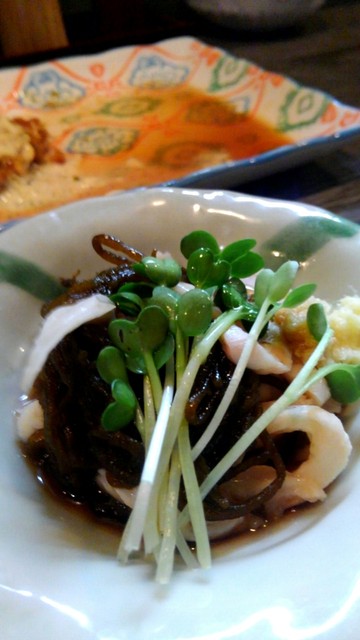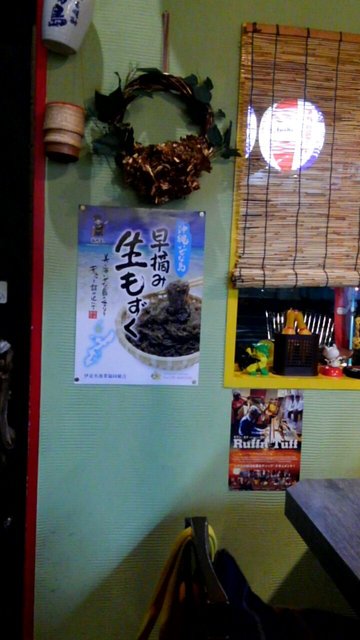 テーブル席お客様が帰られてから落ち着いたので、新メニューの沖縄伊是名島産のプレミアムな早摘み生もずくを店主自家製たれのもずく酢で頂きました。