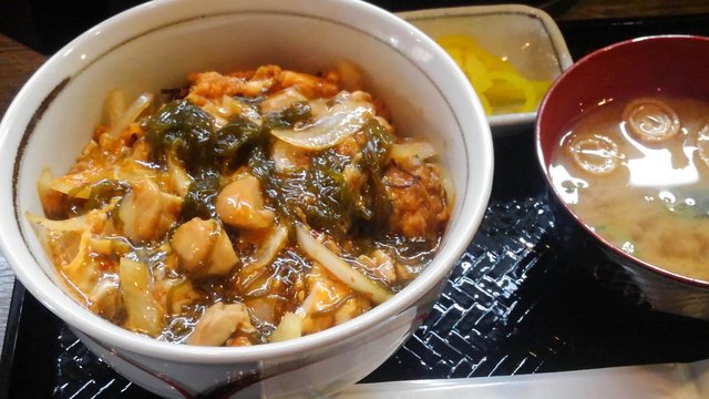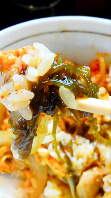 トッピングも色々出来ます。もずく好きな私のために、今が旬で、この時期だけの新物の早摘み生もずくが入ったそうで、それをトッピングして辛い親子丼で、もずくトッピング!!❤(///∇///)にして頂きました。