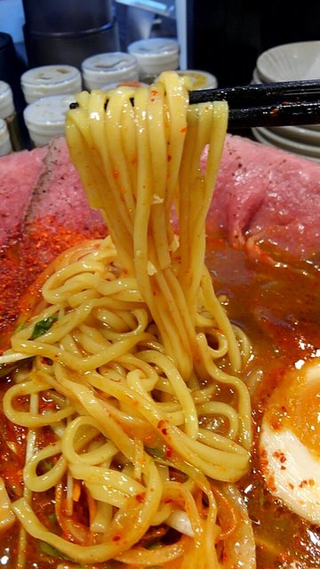 スープも麺も、ハマる美味しさ。辛さで身体もhot!!❤ 具材のタケノコや、彩り生野菜も良い食感。 和牛ローストビーフ、これで飲めちゃいます!かなり本格的!!素晴らしい出来です。