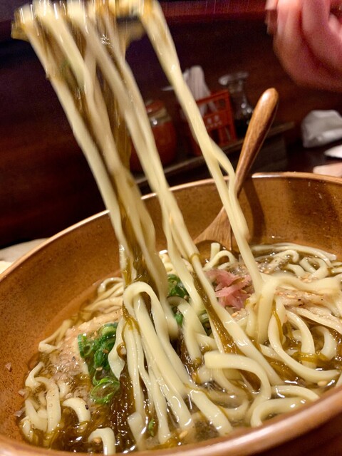 そーきそばに、生もずくトッピングです!これもおすすめ!自家製のコーレグース(泡盛に島唐辛子漬けた調味料)をかけて♥️最高です!✨✨