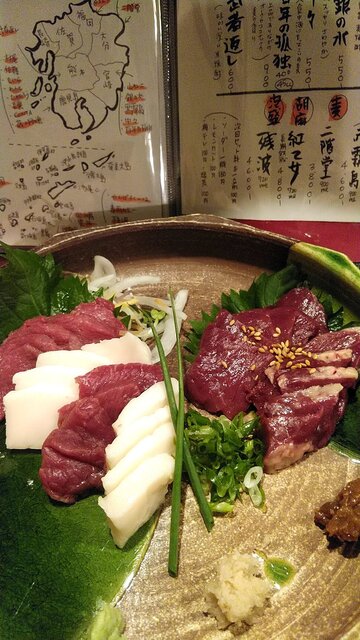 鹿肉は未入荷やったので、いつもの馬鹿盛りじゃなく、今回は、馬刺盛り。たてがみ、ひれ、ハート。お酒が進むぅ!!❤️で、二杯目は、蔵の師魂オレンジのソーダ割り。妻は、たかたろうソーダ割。