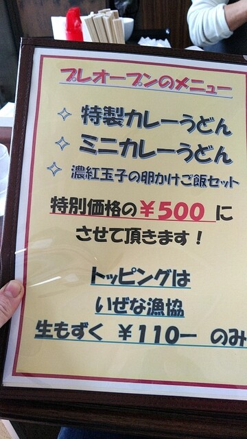 プレオープンメニューは、特製カレーうどんと、ミニカレーうどん濃紅たまごかけご飯セット各500円