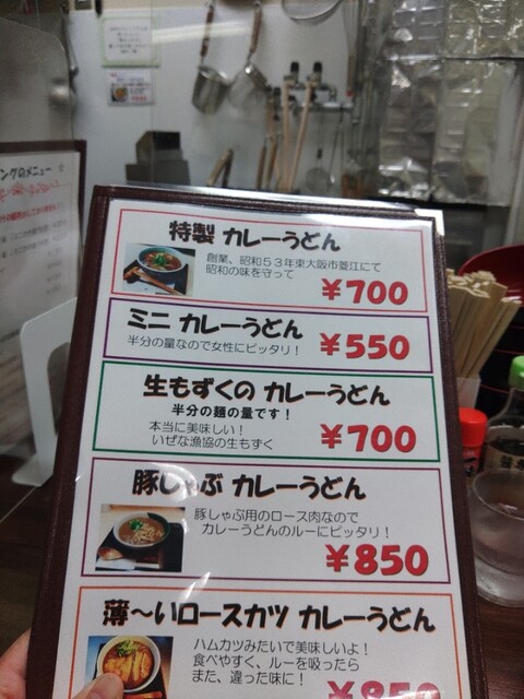カウンターに座り、注文は、二人とも、生もずくのカレーうどん(麺半玉)670円で、私は牛肉コロッケ110円と、野菜かき揚げ120円。