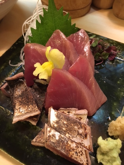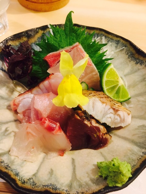 お造りは少しずつ盛り合わせをお願いしました。一人ずつに綺麗に盛られたお造り。この日は2・5キロもある立派な金目鯛が入ってて、それも出してくれました、他にノドグロ、カンパチ、カツオ、鯛の盛り合わせ。塩と造り醤油が付きますが、どれもお塩で食べるのが好き。金目鯛、ノドグロ、塩とワサビで(~▽~@)♪♪♪