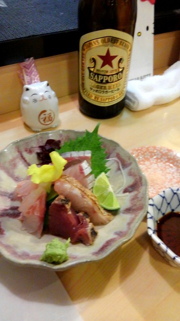 場所は駅から少し歩いた住宅街。予約して営業時間前に到着したのですが準備中にも関わらず入れてくれました。暑くて喉が渇いたので、先ずはビール。ここはサッポロ赤星、瓶ビールです。