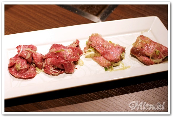 右のコールドレアステーキは、オリジナルユッケたれでいただきますが