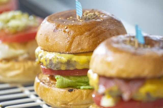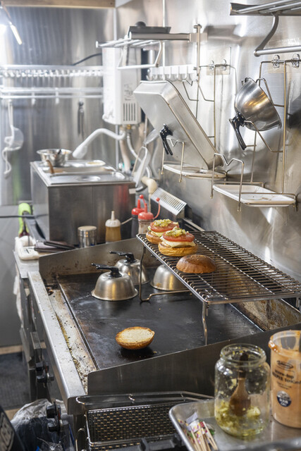 調理中の風景。おそらくはベーコンチーズバーガー(1,300円)の完成。