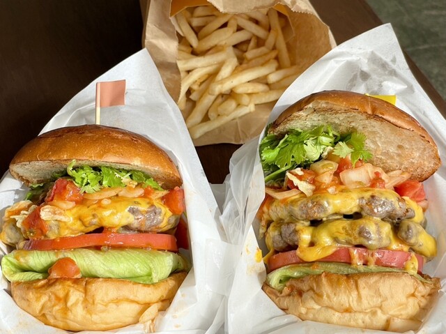 左:サルサチーズバーガー(1,450円)、右:サルサチーズバーガー+100%ビーフ肉(1,450円+450円)、奥:フライドポテト500円。