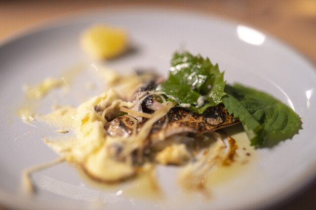 ブリをラズベリービネガーで締めたもの。マッシュポテトの上に乗せて供されました。ツンとくる酸味ゼロの、これまでに味わったことのない締め魚。