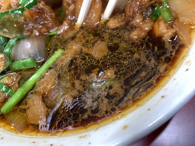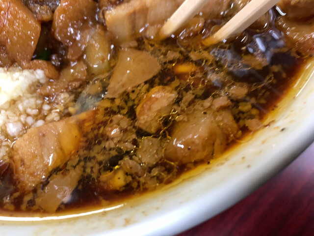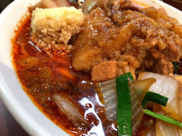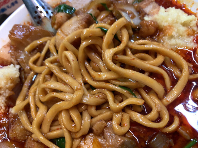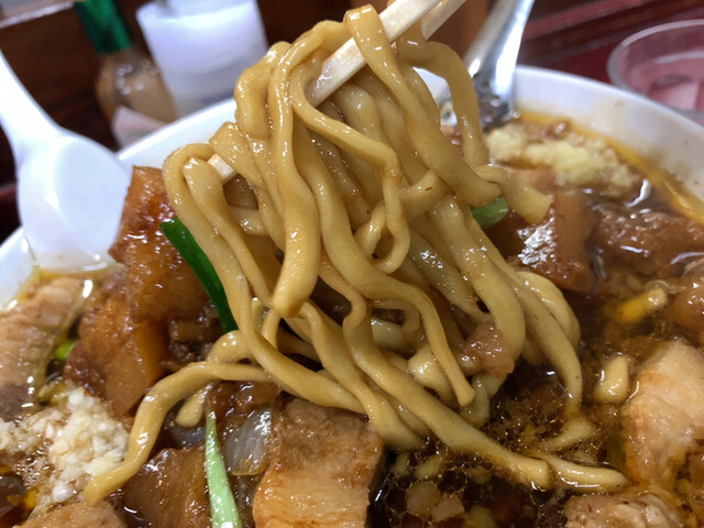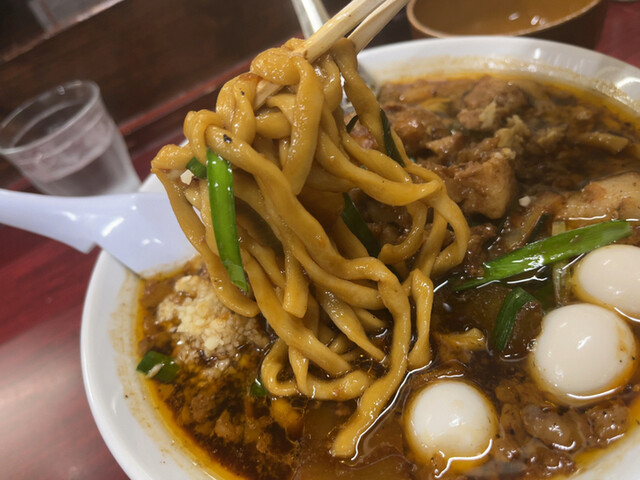 スープ、ラー油の辛さ、玉ねぎ、など勝浦タンタンメンが連想される、麺は粉の旨味、太麺で固めでゴワゴワとして二郎を連想させる。