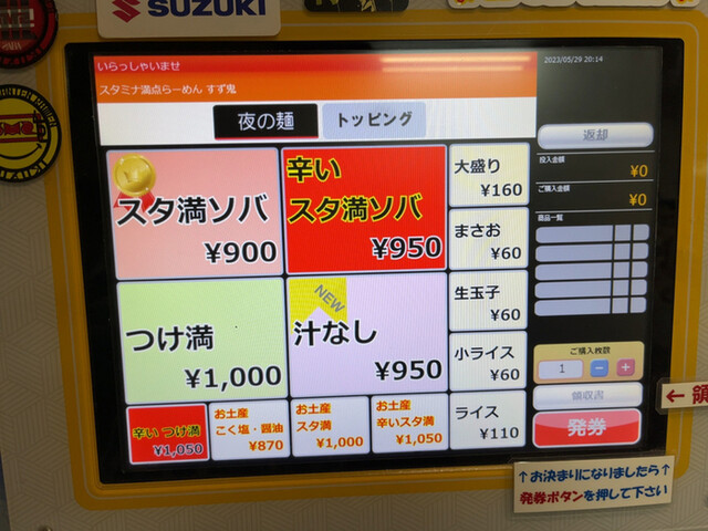 スタ満ソバ900円、まさお(うずら)3個60円、生玉子60円、小ライス60円