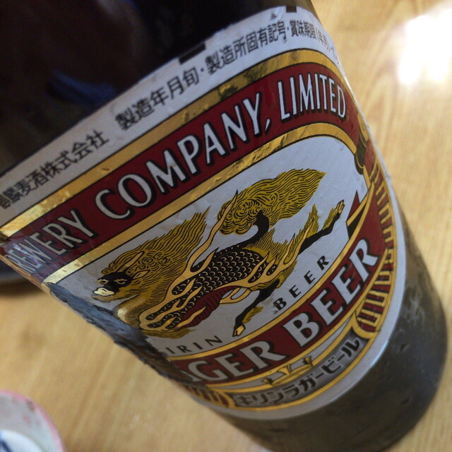 キリンラガーの大瓶です。キリンしかないのかと思っていたのですが、アサヒも置いてあり、どちらを飲むか聞かれました。川崎・鶴見だったらキリンです。鶴見区生麦にはキリンビールのエ場があり、昔から、川崎・鶴見の労働者は、仕事の後に飲むお酒はキリンラガーと決まっていました。丸大ホールの雰囲気に合うのはキリンラガーですし、お店で使っているジョッキもすべてキリンのものですね。