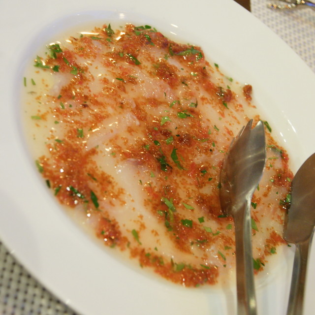 北陸新幹線開業で盛り上がっている石川県産の魚を使ったマリネです。たっぷりのオリーブオイルでマリネし、自家製のニンニクチップとトマトが散らしてあります。マリネすることで繊細な白身魚の美味しさがぐっと引き立ちますね。