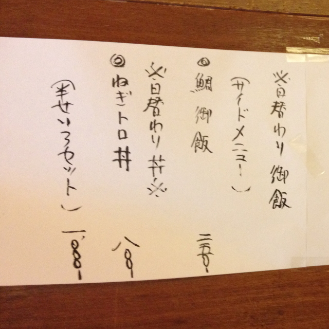 この日は、ネギトロ丼でした。厳密にはトロではなくてすき身やぶつ切りにするような部位を崩したものですが、本マグロを使用しているのか、とにかくこれが旨いです。丼は、卵の黄身ものせてあり、ネギは混ぜ込むのではなく横に添えてありました。好みの具合に混ぜていただけるので、見た目だけでなく舌にも嬉しい盛り方です。