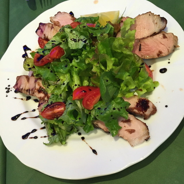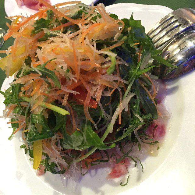 鯛の身が見えないぐらいにたっぷりと野菜が盛られていてとてもヘルシーですね。味付けも総じて抑えめで、鯛の味を殺さないようにしてあります。全体的に上品で穏やかな味わいの中で個性を出しているのはルッコラセルバチコで、この風味が刺身でいうところのわさびのような役割をしています。