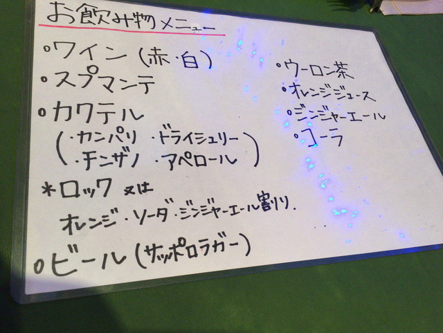 ドリンクは、スプマンテ、ワイン(赤・白)、ビールはサッポロラガー、リキュール類がカンパリ・チンザノ・アペロール・ドライシェリー、ソフトドリンクです。さらに今回は、ウイスキーも用意してくれていて、ハイボールも頼めました。